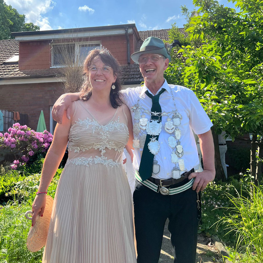 Die Regentschaft von Jannik Sasse und Ann-Kathrin „Anka“ Behning ist zu Ende, der neue Schützenkönig ist gefunden. Drei Kandidaten nahmen in diesem Jahr den hölzernen Vogel ins Visier: Der erste Vorsitzende Sven Hinderscheidt war ebenso dabei wie Klaus Link und Christian Sedlatzek. Am Ende konnte der Fahnenoffizier der dritten Kompanie, Christian Sedlatzek, den entscheidenden Treffer landen. An seiner Seite ist seine Frau Nina Sedlatzek die neue Königin. Ein schönes Geschenk zur Hochzeit: Das Paar hatte erst am Freitag direkt im Schützenfestzelt geheiratet.
